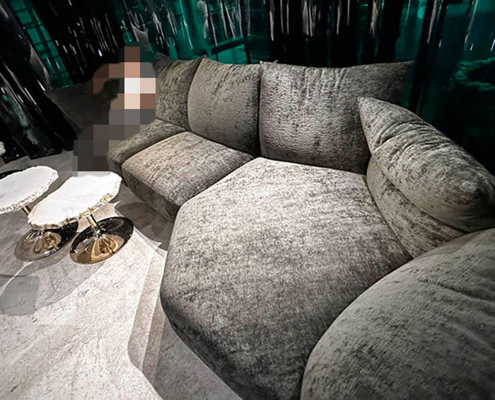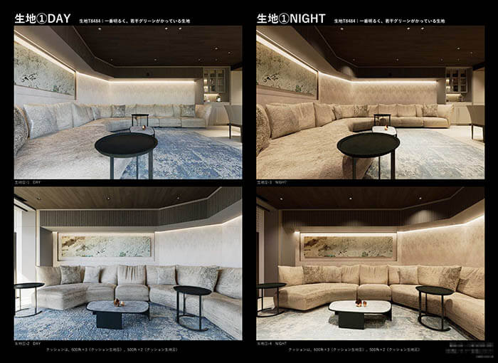 こちらがソファの2色展開のCGです。ベルベット生地のように見る角度で色の濃淡が変わる生地は、CGでの再現がかなり難しく、前田君もCGの色味調整を最後まで頑張ってくれました。