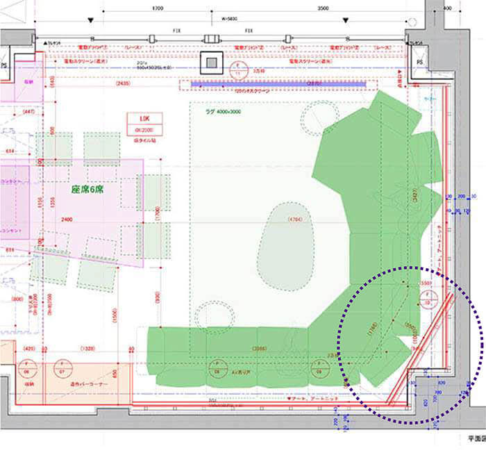 紫の点線で囲んだ部分が柱型を斜め壁でカバーした案です。