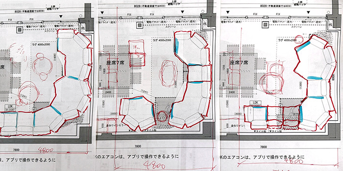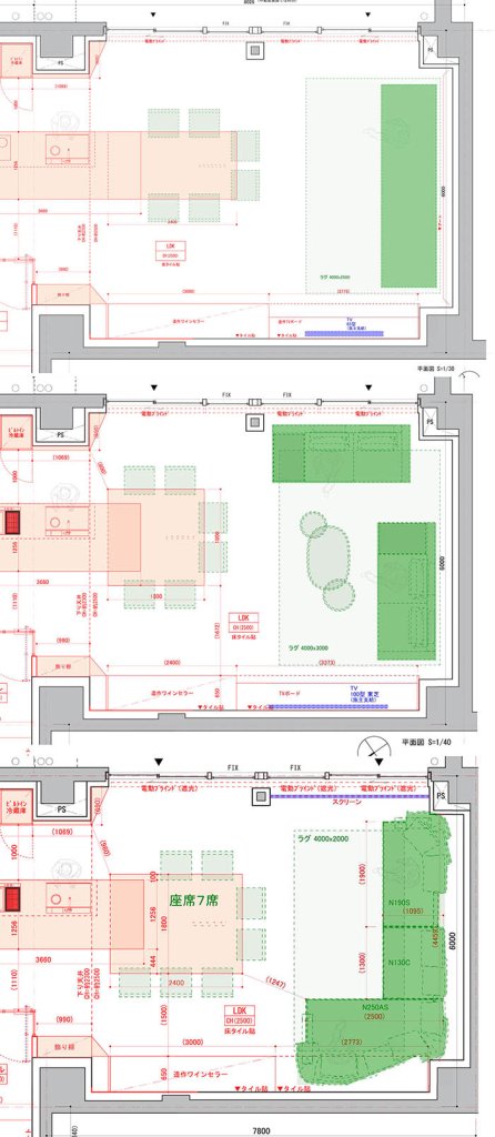 当初案は、上のシンプルな一直線のソファでしたが、そこからセパレートなL字を経て、変形L字へと変化していきました。部屋のコーナーの柱型と、テレビをどこに置くかでソファレイアウトのバリエーションが生まれるのですが、普段テレビを見る時間が多い訳ではないので窓際に電動スクリーンを設置して、プロジェクターから映写することにしたことで、ソファの位置は決まってきました。
