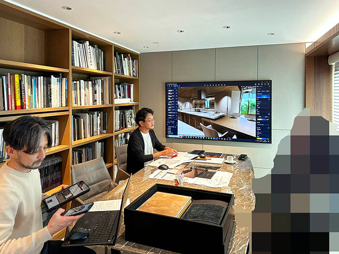 この日のRさまご夫妻とのお打ち合わせは、初めて南青山に事務所を引っ越してからでしたので、打合せ室のモニターを使って、前田君がリアルタイムでCGの色味を変えながらのお打ち合わせとなりました。その中で上記のCGを見て、ソファの色味が沈み込みすぎていて、暗く感じるとのこと、もう一度エドラのショールームに行って確認しようとのことになりました。新事務所からエドラまでは歩いて7~8分、お客さまの車で5分の距離で、お客さまも事務所が南青山に移ったこと喜んでくださいました。