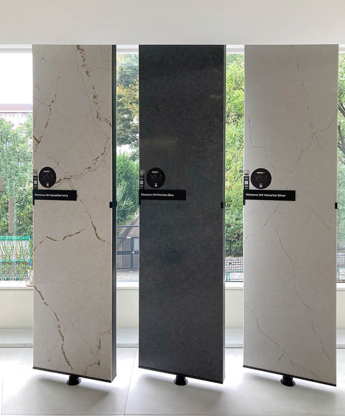 コセンティーノ・ジャパンは、これまでも大判セラミックのデクトンや、クオーツストーンのサイルストーンの両者を扱っていましたが、3年ほど前に南青山に「コセンティーノ・シティ東京」という名の美しいショールームを開き、そこに「センサ」というシリーズ名で、ただでさえ強いクォーツサイトに工場で染み防止処理を浸透させた石材のシリーズとして売り出したのです。