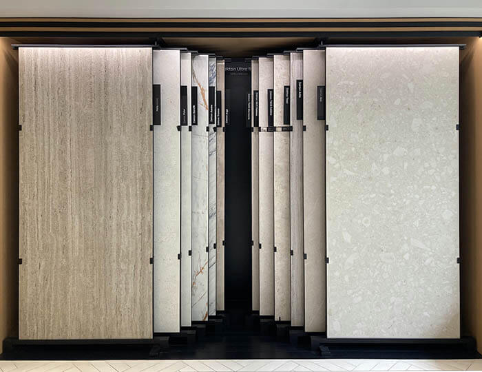 セラミックもクオーツストーンも天然石も大きなサンプルで見ないと、その雰囲気を正確に理解することが難しいのですが、このようにショールーム内に大判サンプルが置いてあるのもコセンティーノのショールームに行く価値があると感じています。