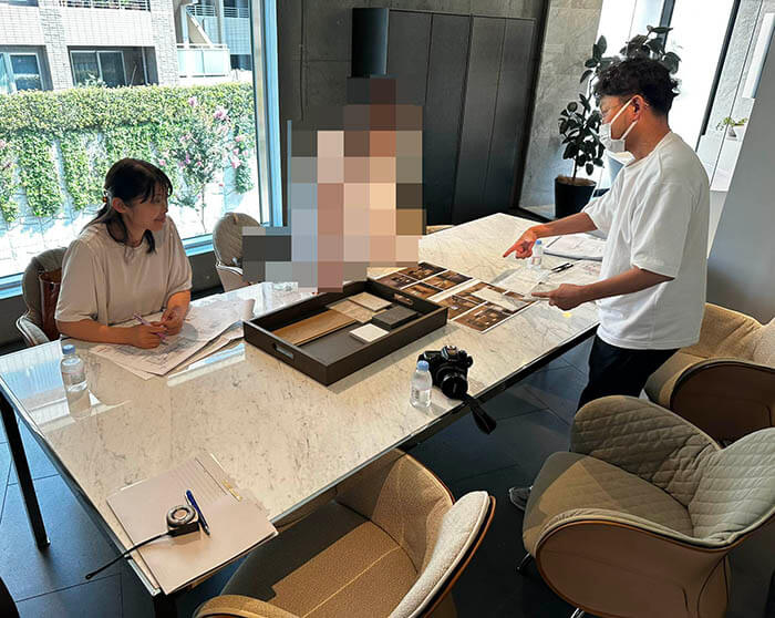 リビングダイニングで使われている素材が黒いトレーの中に入っているもので、これまでの打合せでお見せしてきたCGも並べながら、どのようなイメージになさりたいかを伺わせて頂きました。
