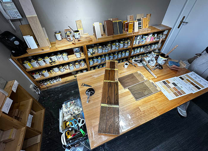 まだ白金台だった頃の事務所にSさまの奥さまに来ていただき、サンプルを見ながらどの塗装で仕上げるかを決定させていただきました。最終的に決まった仕様はオスモ・フロアカラーのテラ色(2回塗り)となりました。