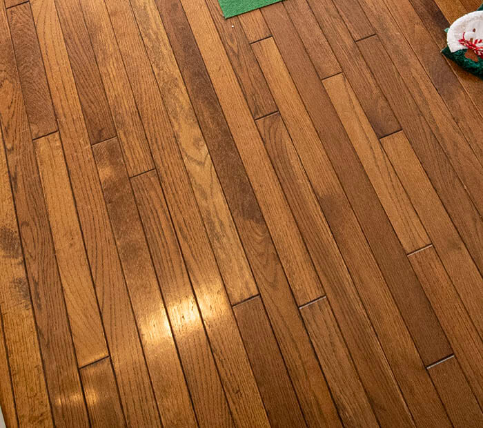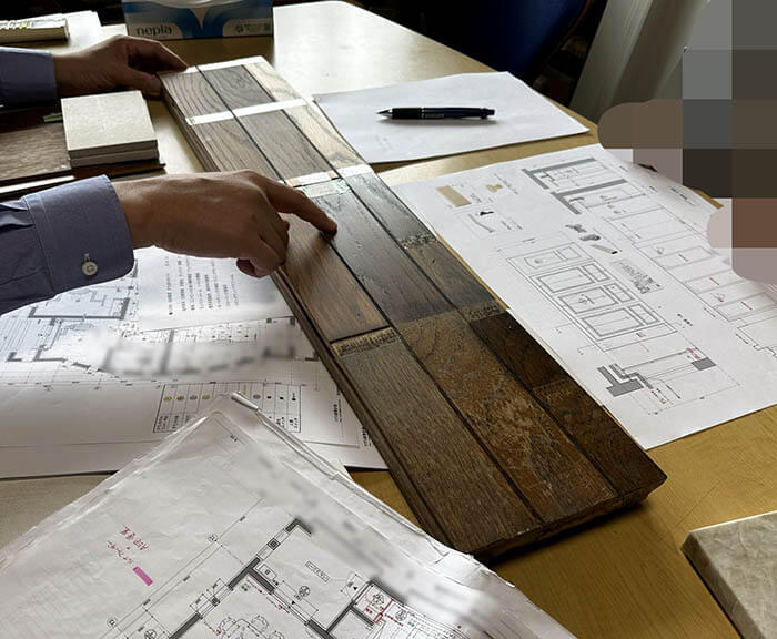 こちらが既存の床フローリングの状況です。住み始めてから20年近く、これまで何度もお客さまご自身でワックスがけしながら大切に使ってきたそうです。設計者として現地を拝見した瞬間から、この素材は「残して活かす価値がある」と直感していました。ただし、ワックスが所々で剥がれてムラが出ている状態でもあり、全面的に手を入れることになりました。