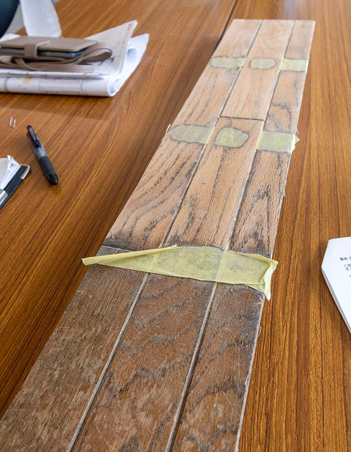 現場では、幅3本分が繋がった状態で約80cmほどのサンプル材を用意し、手前は既存(ハゲハゲのワックス付き)、奥はワックスをサンダーで剥離した状態にして貰っています。