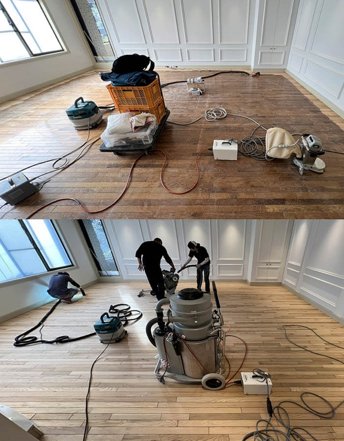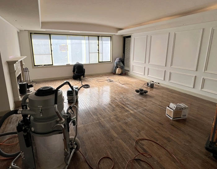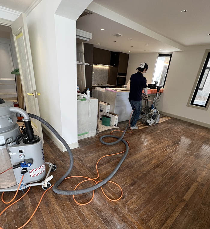こちらが既存フローリングの研磨に入った様子です。手前の大きな機械が研磨機ですが、最初は壁際で研磨機が動かせない箇所を手持ちのサンダーで削るところからスタートです。
