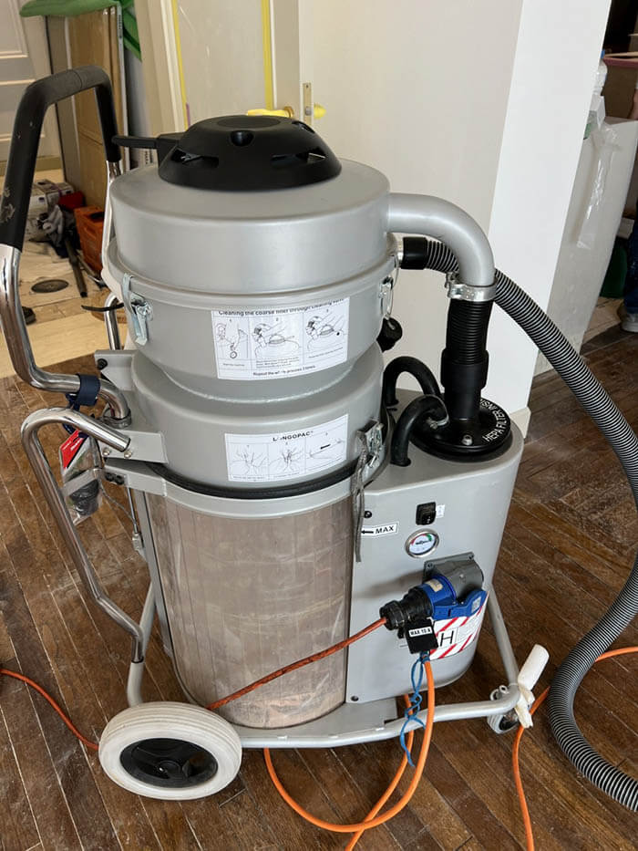 こちらが細かく壁際まで削れる手持ちサンダーです。機械の後ろの膨らんだ布袋部分で集塵されています。
