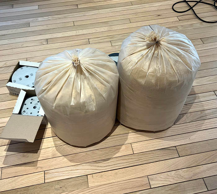 約55平米のリビングとダイニングの床材の表面を削ってでたおが屑の量はこれだけになるのです!