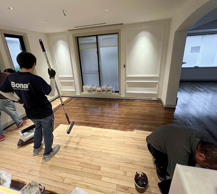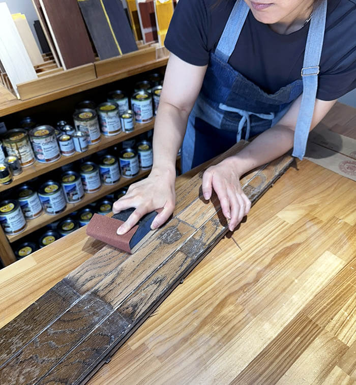 すぐに塗装してくれるのか思っていたところ、フローリングの表面を確かめてくれた担当者が、これではまだ削り足りないので、もう少し削る必要があるとのことで、すぐにサンディングから取り掛かってくれました。現場でも、いい加減に削っただけだと色の載りが悪くなってしまうので、「サンドペーパー(紙やすり)は荒い順から80→120→180へと細かくしていき、塗膜を完全に剥離すること」との指示をしてくれました。