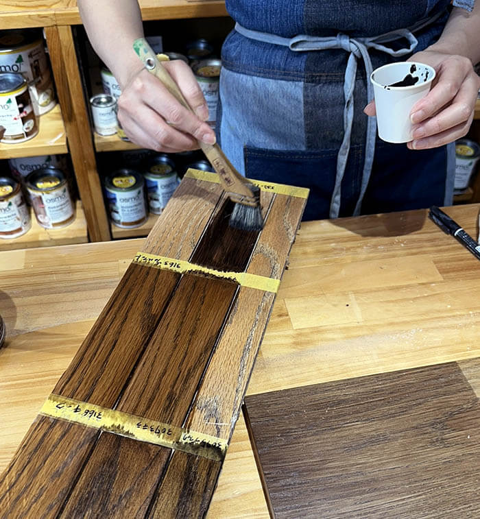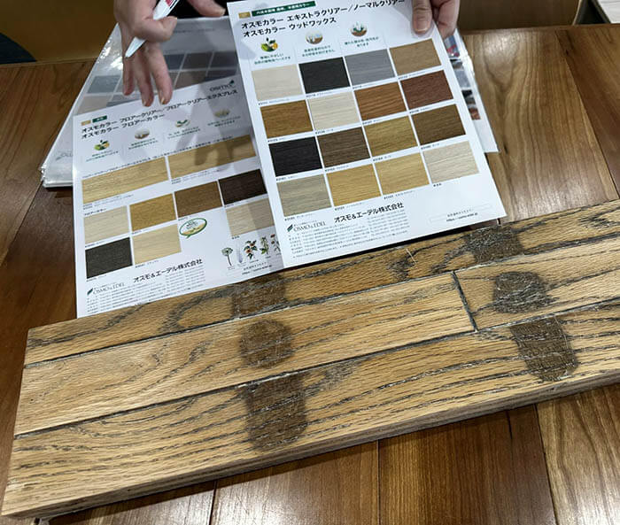 オスモはドイツの自然系木材塗料ブランドで、植物油と天然ワックスを主体にした浸透型塗料で、木材内部に浸透して保護する塗料を販売しています。塗膜を作らず木材が呼吸でき(通気性)、木材の質感を活かした仕上げが特徴です。似たような塗料としては、リボスやアウロがありますが、今回は天然成分の配合度合い、耐久性とカラーバリエーションと価格のバランス、またサンプルを持参しての色実験ができることを考えてオスモを採用することとなりました。