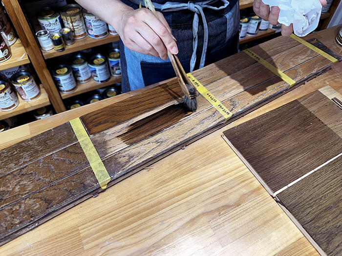 当初は目立たない箇所で現地サンプルとして試す計画でしたが、スケジュールの都合や、濃い色を付けてしまうと薄く戻すのが困難であることから、キッチンとダイニングの混じりき部分で不要となったフローリング箇所を剥がしてもらい、これをサンプルとして色合わせを行うことにしました。