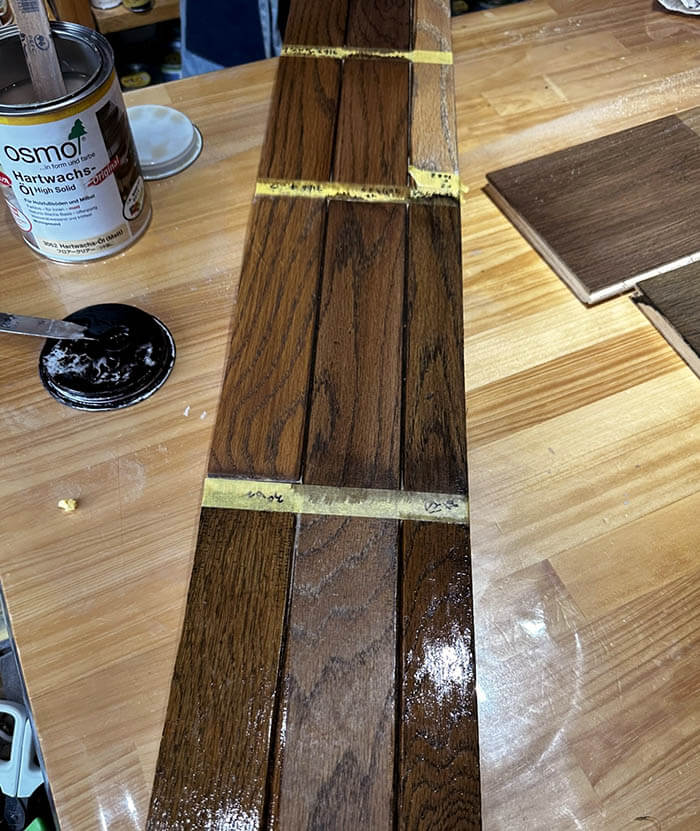 当初は考えていませんでしたが、既存のフローリングの塗装を剥離せずに上から塗るサンプルも最後には作って貰いました。この日は天然系塗料の特徴や、その塗布の仕方を丁寧に教えて貰い、とても勉強になりました!